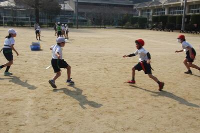 体育科では、ゴール型ゲーム「タグラグビー」の学習が終わりました。この日は、学習のまとめとしてリーグ戦を行いました。特別ルールとして「チーム内であまりトライをしていない人がトライをしたら2点(一人)」を付け加えました。ボールを持たない人の動きや、タグをとられた後の動き、特別ルールの活用などを考えながら、ゲームを楽しみました。