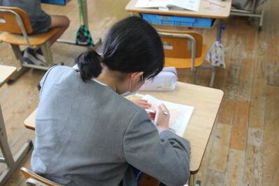 音楽科では、いろいろな音のひびきを感じ取ろうという学習を行っています。「パフ」という曲を使って、重なり合う音のひびきを感じとりながら、リコーダーで演奏する活動です。楽譜に階名を書き込んでリコーダーで演奏の練習をしました。
