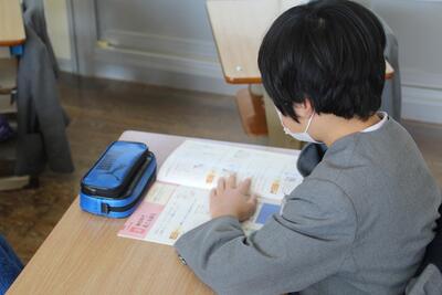 音楽科では、鑑賞の学習を行いました。グリーグ作曲「ペールギュント」第1組曲「山の魔王の宮殿にて」を聴き、旋律の繰り返しにきをつけながら、速さ・強さ・音色などの変化を感じ取る学習です。主な旋律が18回繰り返されている曲で、子どもたちは「正」の字を書きながら何回繰り返されているのか確かめていました。