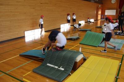 体育科では、とびばこ運動の学習をしました。開脚跳び・かかえこみ跳び・台上前転・首はね跳びなどの技を練習しました。マットなどを準備して、動きの感覚づくりを行い、技を習得する活動を行いました。易しい場から難しい場に進めるように場づくりを工夫しました。みんなで協力して上手にできるようになりました。