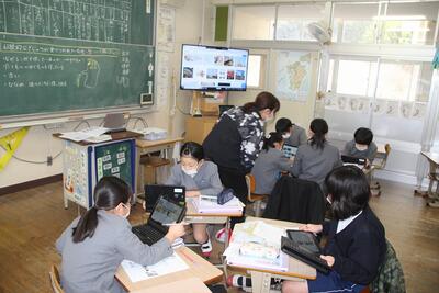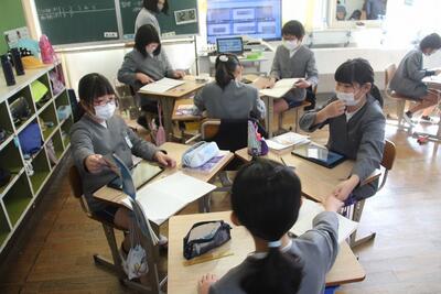社会科では、熊本県の学習のまとめとして自分たちで調べた八代市のことを、クイズにして出し合いました。これまで学習してきた荒尾市の小代焼を生かしたまちづくりを参考にして、八代市の友好都市やクルーズ船の入港などを出していました。コロナの影響が少なくなり、外国とのつながりがまた強くなりそうです。
