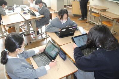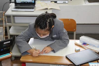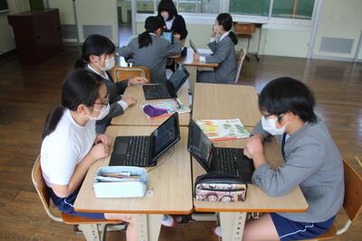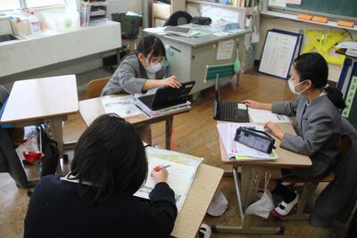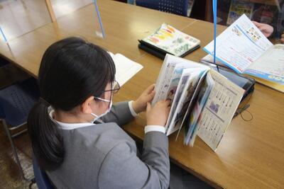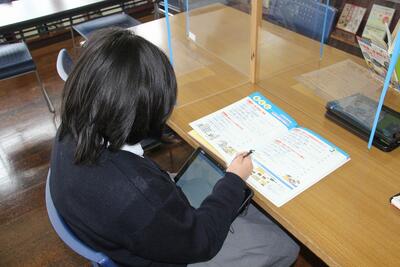 国語科では、自然災害への備えについて自分のテーマを決め、自分の考えとそれを支える理由や事例との関係を明確にして、書き表し方を工夫する学習をしています。自分のテーマに合う情報を集めて、それらを整理していました。