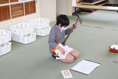 音楽科では、日本の楽器に親しむ学習をしています。この日は、三味線を習っている児童が先生になって、演奏をしたり演奏の仕方を教えたりしてくれました。曲によってチューニングすることや三味線の楽譜など、初めて知ることがいろいろあり、学びが大きい機会となりました。Sさんと家族の皆さん、ありがとうございました。