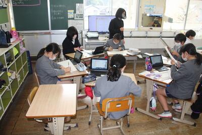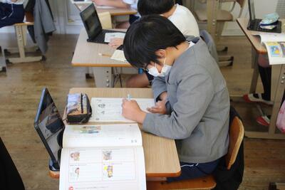 国語科では「ウナギのなぞを追って」という教材文を使って、「興味を持ったことを中心に、紹介しよう」という学習を行っています。教材文を使って、「本のあらすじ、要約、感想」という紹介する文章の構成を学習します。教材文が長文なので、どこを興味の中心にするか悩むところです。教科書やデジタル教科書を使って、興味の中心を探していました。