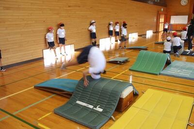 体育科では、とびばこ運動の学習をしました。開脚跳び・かかえこみ跳び・台上前転・首はね跳びなどの技を練習しました。マットなどを準備して、動きの感覚づくりを行い、技を習得する活動を行いました。易しい場から難しい場に進めるように場づくりを工夫しました。みんなで協力して上手にできるようになりました。