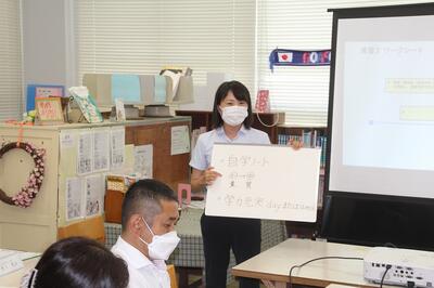 校内研修では、八代市教育サポートセンターのT先生に自立活動について講話をしていただきました。本校のT先生が自立活動の授業をしてもらい、職員で質疑応答や感想交流をした後に、サポートセンターのT先生に自立活動の説明や授業の指導・助言をしてもらいました。すべての子どもたちが自分らしく生きていける教育を展開していきます。