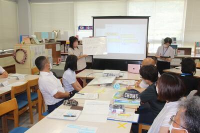 今回の校内研修では、M社のコミュニケーションツールの研修を行いました。講師はICT支援員のFさんとIさんでした。クラスの作り方、投稿機能、ビデオ会議の参加方法、ビデオ会議中にできる操作などを教えていただきました。