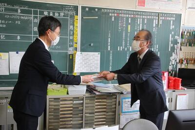 校内研修の前に、スクールライブラリー助成金交付式を行いました。日本教育公務員弘済会熊本支部の吉田様より交付証と10万円をいただきました。児童用図書購入のために活用したいと考えています。吉田様をはじめ関係者の皆さん、ありがとうございました。校内研修では、人権レポートの学習会を行いました。自分の実践を振り返り、学んだことや見えてきたことなどを出し合いました。