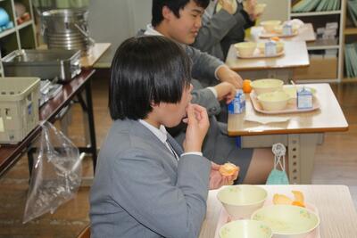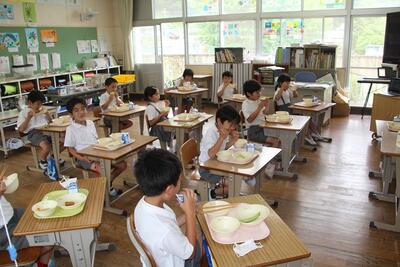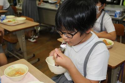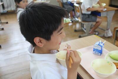 今日の給食メニューの中で地元で収穫された旬の食べ物は、梅干しとメロンです。2年生の教室に行って、おいしそうに食べる東陽っ子を取材しました。「おいしい!」と言って、幸せいっぱいでした。東陽町で生まれ育って良かった。給食に関わるすべての人に、ありがとうございます。