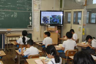毎月19日は食育の日です。「ふるさと熊産デー」として、給食に東陽町産の旬な食べ物を入れています。この日は、ブルーベリーです。