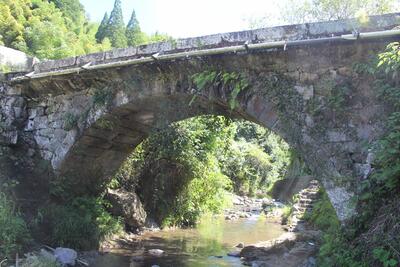 この橋は、1848年に橋本嘉八さん(橋本勘五郎さんの父)によって架けられたと伝わる石橋です。県道25号線沿いの笠松橋から500m上流にあります。現在はこの隣に新しい橋が架けられ、あまり使われていないようですが、作られて174年後の今でも堂々としています。