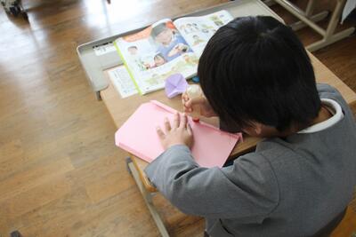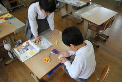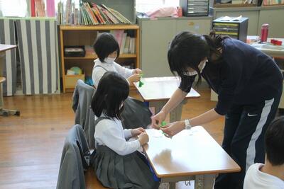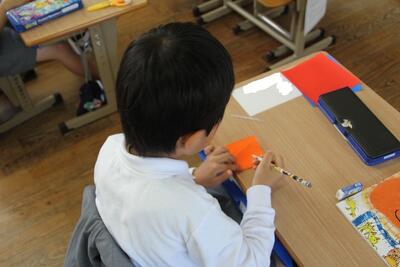 生活科では、新1年生の体験入学をひかえたこの日に、プレゼントづくりを行いました。生活科の学習で育てたアサガオの種を新1年生にプレゼントします。折り紙でアサガオを折ったり、プレゼントイレの袋を作ったりしました。新1年生が喜んでくれるとうれしいです。