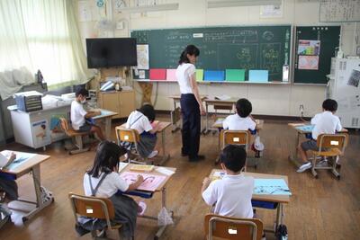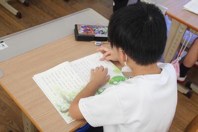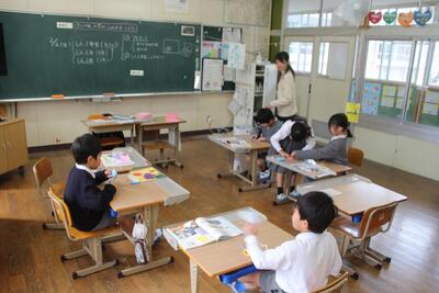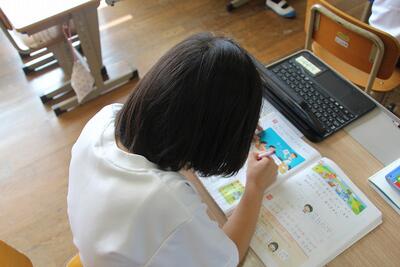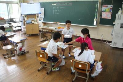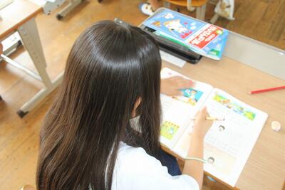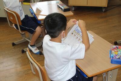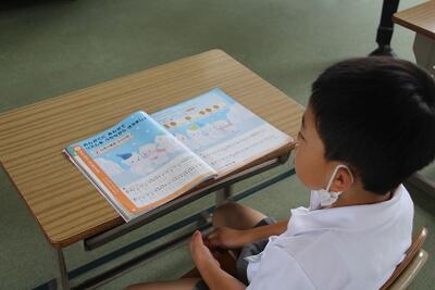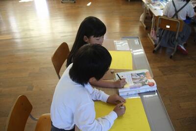 国語科では、説明文「うみのかくれんぼ」を使って、事柄の順序を捉えたり、文章中の大事な語句や文を選び出す学習をしています。この日は、「たこのかくれかた」についてペアで読み合ったり大事な語句を選んだりしました。音読するのが上手になってきました。