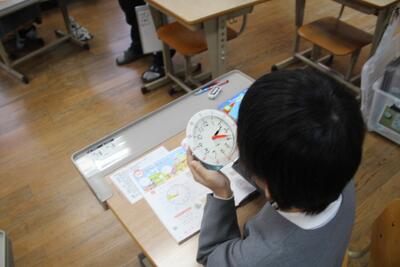 算数科では、時計や時刻、長針・短針のさす目盛りに着目して、何時何分をよんだり表したりする学習をしています。この日は、長針がさす何分の目盛りについて考えました。一周が60分で、5・10・15・・・と数えていくことを考えつきました。時計の模型を使って、仕組みを学習しています。