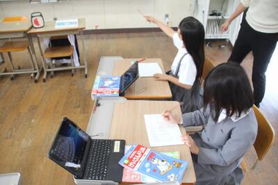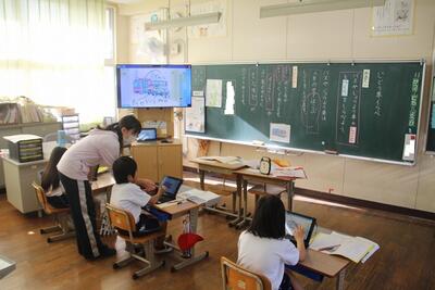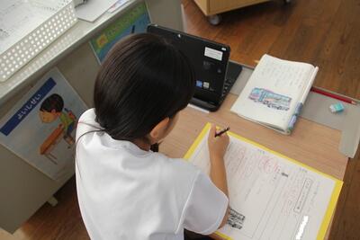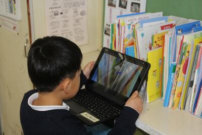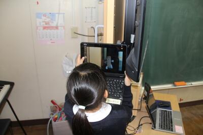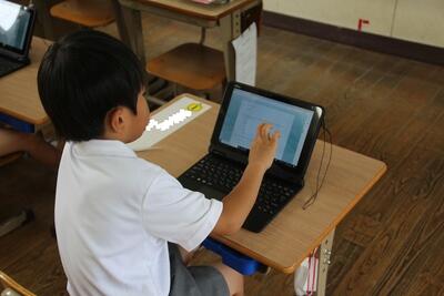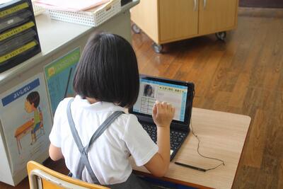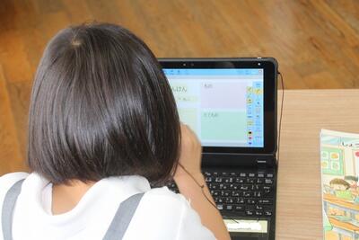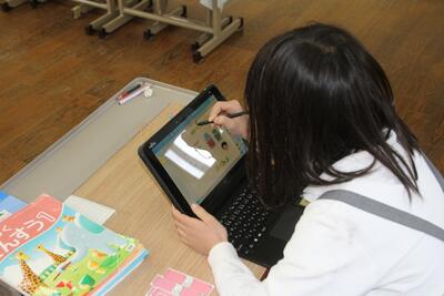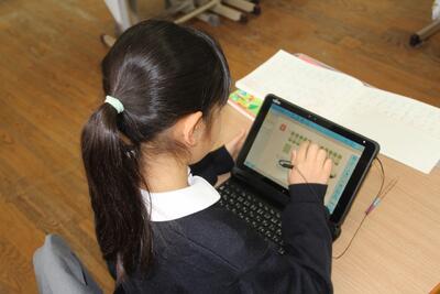 本校では、毎月児童にアンケートに答えてもらっています。この日はタブレットの画面に出てきたアンケートに答えて、入力しました。入学して2ヶ月が経ちますが、タブレットPCの使い方にも慣れてきました。