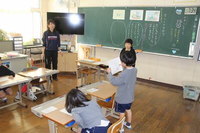 国語科では、物語「くじらぐも」を使って、物語を読んで場面の様子や登場人物の行動を想像したり、物語の大体をとられたりする学習をしてきました。この日は、そのまとめとしてナレーター役や登場人物役になりきって、音読劇の練習を行いました。この後、2・3年生にこの音読劇を披露する予定です。