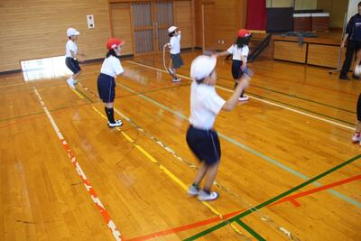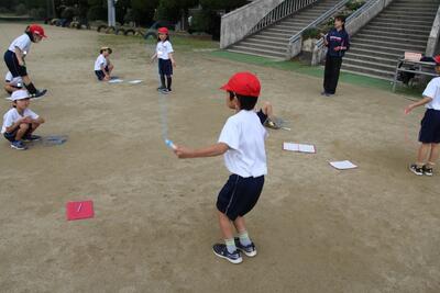 体育科では、校内なわとび大会に向けて短縄でのなわとびの練習をしています。前跳び・後ろ跳び・あや跳び・交差跳び・二重跳びの30秒間に跳ぶ回数と、3分間の持久跳びです。ペアで活動し、友達の回数を数えて、学習カードに記録を記入していきます。自己記録の更新めざしてがんばっています。