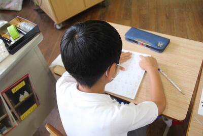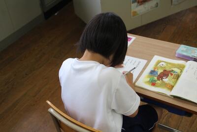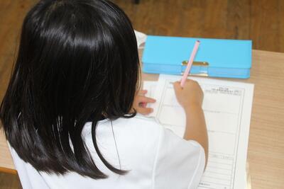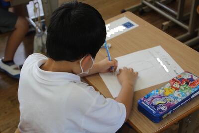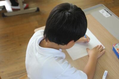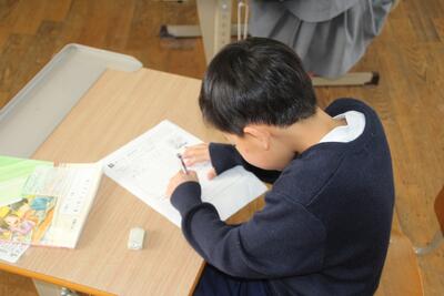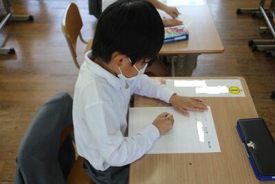 学期末に学校で行うことの一つにテストがあります。この日はひらがなのテストがありました。問題の絵を見て、それに当てはまるものの名前などをマスに書きました。一画一画丁寧に書くことができた1年生です。