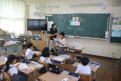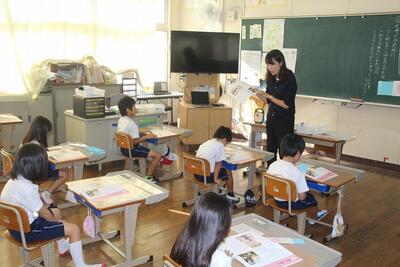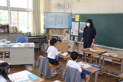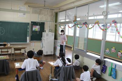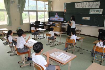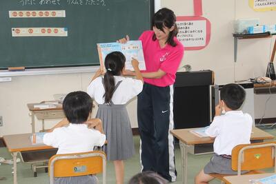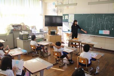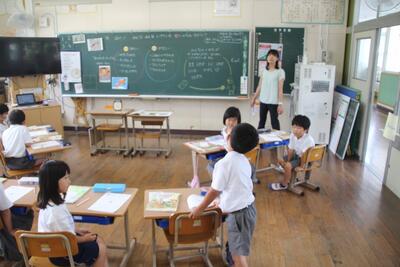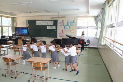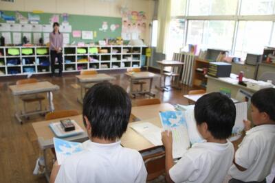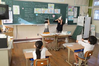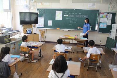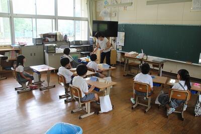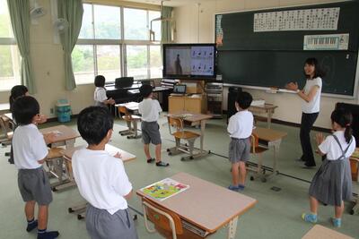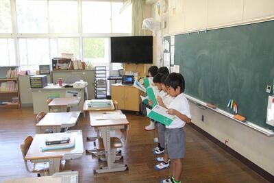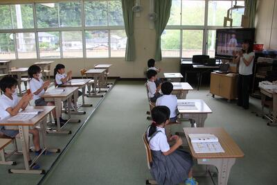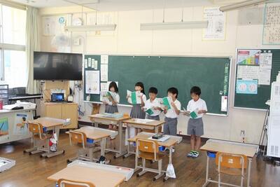 夏休みを前に平和学習を行いました。「トビウオのぼうやはびょうきです」という絵本の読み聞かせを行いました。核兵器廃絶と平和の尊さについて絵本から感じとりました。また、ALTのA先生が最後の勤務日だったので、みんなでお礼の言葉を伝えました。
