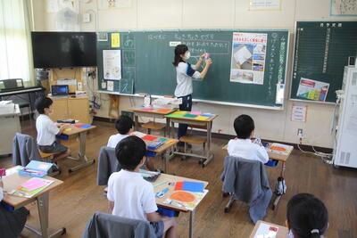 算数科では、ものとひとのかずという学習をしています。この学習では、絵や図を用いて別のものに置き換えたり並んでいる数から順番を考えたりする活動です。タブレットPCにある学習シートに自分の考えを書き込んで、みんなの考えを共有しました。学習リーダーを中心に学習を進めています。