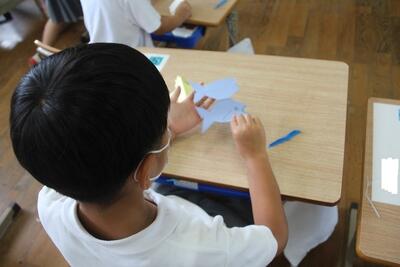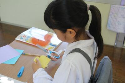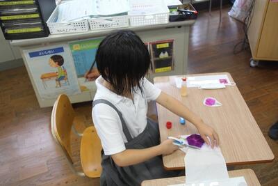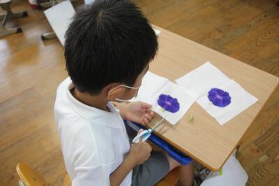 生活科では、育てていたアサガオの花が咲きました。この日はアサガオを押し花にしてしおりを作りました。花を紙にはさんで広げた時に、その色のあざやかさに1年生は歓声を上げました。はさみでその周りを切り取り、しおりにしました。自分たちで育てた植物からものを作る喜びを味わいました。