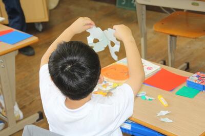 図工科では、ちょきちょきかざりの学習を行いました。折り紙を4つに折り、一番上の紙にもようをかき、それをはさみで切って、折った紙をひらきました。自分が想像していなかった模様ができると「わーっ!」と歓声をあげ、持ち上げたり顔をおおったりして楽しみました。鉛筆でのもようのかき方、はさみの使い方が上手になってきた1年生です。