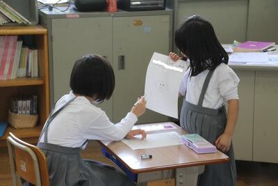 図工科では、すきまちゃんの目で、すきまちゃんと一緒に身の回りのすきまを見つけて、いろいろな形などをとらえながら、すきまの形の面白さや楽しさを感じとり、見方や感じ方を広げる学習をしました。すきまテープとモールなどで自分の分身である「すきまちゃん」を作り、それをすきまにおいて、タブレットPCで撮影しました。撮影した画像をみんなで鑑賞しました。すきまの見つけ方が上手な1年生です。