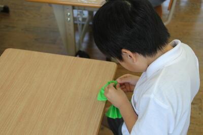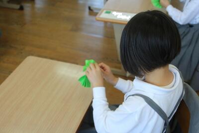 運動会で花笠音頭を披露する予定です。この日は、その花笠に付ける紙花作りを行いました。紙をきれいに折って中心を輪ゴムでとめ、折った紙を開いて花のように形を整えていきました。1年生は、上手に紙花を作ることができました。