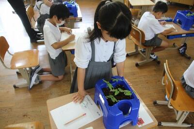 生活科では、アサガオのかんさつを行いました。形や色・さわった感じ・においなど五感を使って気づきを学習シートにまとめました。これからアサガオの生長と自分の成長をつなげていきます。