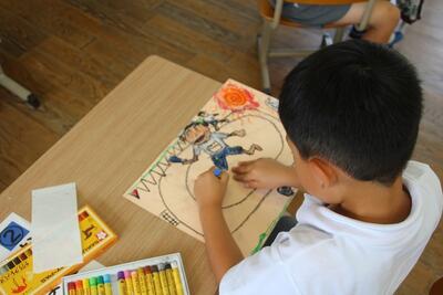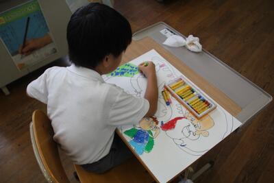 図工科の学習では、「みてみて あのね」という生活経験を絵に表す学習をしました。この日行ったプール開きや、昼休みに遊んだドッジビーなど楽しかった思い出を中心に絵に表していきました。クレパスを使って、形や色を考え、表現活動を楽しみました。