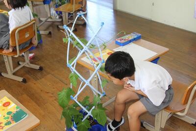 生活科では、2年生にもらったアサガオのたねの観察をしました。形をよく見て学習シートにたねの絵をかきました。「チョコレートみたい。」「鼻に入れたくなった。」など、色や大きさ・さわった感じ・においを感じとっていました。