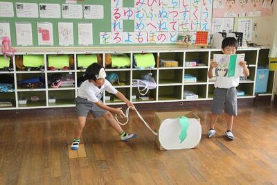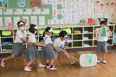 国語科では、物語「おおきなかぶ」の学習が終わりました。学習のまとめとして、音読劇を行いました。1年生はお面をつけて役になりきっていました。ナレーター役が進めると、「うんとこしょ、どっこいしょ」と声をそろえて、おおきなかぶをぬく動作をしました。全員で力を合わせておおきなかぶをぬく瞬間は、見ている方が気持ちよくなりました。みんなの力で音読を作り上げた1年生です。