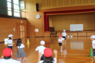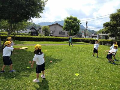 体育科では、児童用のハンドボールを使って、三角コーンを倒すゲームを行いました。攻撃側3人対守備側2人のルールで、攻撃側が一人1個のボールいつ・どのように投げるのかを考えながら活動しました。チームで作戦を考え、ポジションやタイミングを工夫しました。三角コーンが倒れたときの歓声やリアクションが大きくなりました。