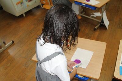 図工科では、いろいろな色水をつくる学習を行いました。ペットボトルキャップに少量の絵の具をつけて、ペットボトルの中に水を半分入れて、シェイクします。すると、透明な水が鮮やかな色水に変身しました。歓声を上げて色の美しさに見とれていました。
