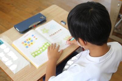 算数科では、たし算を学習しています。この単元では、繰り上がりのある計算をしています。この日は9+4などの問題について考えました。9に1をたすと10になるので、たす数の4を1と3に分けて計算する仕方を学びました。数を分けて考えることが上手になってきました。