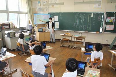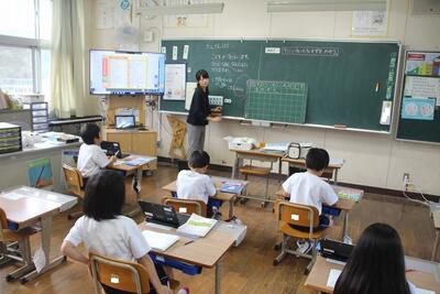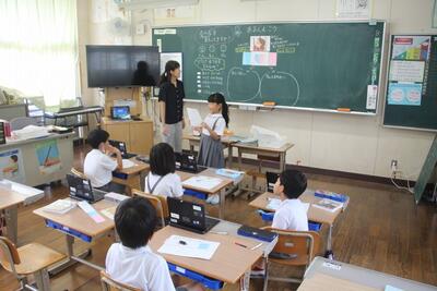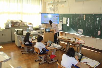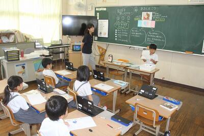 国語科では、事柄の順序を考えながら説明文の大体を捉える学習をしています。この日は、バスや乗用車の仕事とつくりを見つけ、「そのために」でつながっていることを読み取りました。児童の学習意欲を高めるためにタブレットPCの学習シートに書き込んだり、児童の学びのあしあとを確認するために、学習後の振り返りをしたりしました。