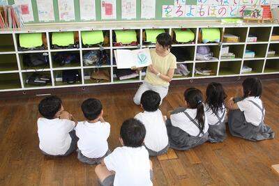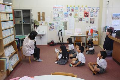 1年生は毎週1回図書の本の借り換えをしています。図書司書のT先生に本を紹介してもらったり、借り換えの手続きをしてもらったりして、いろいろな本と仲良くなっています。この日は、T先生に読み聞かせをしてもらいました。本と仲良しになっている1年生です。