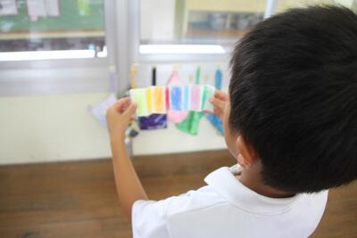 図工科では、「ひらひらゆれて」という学習を行いました。ハンガーにビニル袋を下げて、風に揺れる様子から自分が想像したものを作る活動を行いました。ビニル袋をはさみで切ったり、飾り付けをしたりなど、表したいものの形や色を工夫して作品を作りました。
