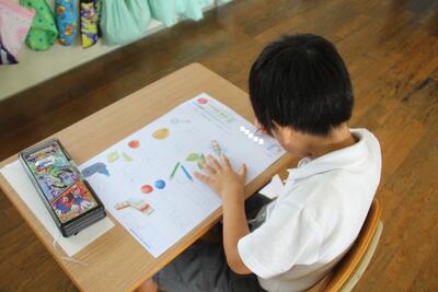 算数科では、1学期に学習した内容を復習しました。1学期では、「かずとすうじ」「なんばんめ」「いくつといくつ」「いろいろなかたち」「ふえたりへったり」「たしざん」「ひきざん」「かずしらべ」などを学習しました。特に、後半の「たしざん」「ひきざん」では、式と答えを書くようになりました。小学校の学習になれてきた1年生です。