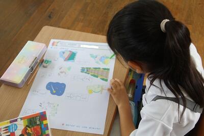 算数科では、たしざんの学習をしています。問題文を読み、必要な情報を把握し、式と答えを考えています。たしざん言葉の「ぜんぶで・あわせて・みんなで・ふえると」を確認して、数図ブロックで手で合わせる動きを確認して答えを出しています。たしざんをがんばっている1年生です。