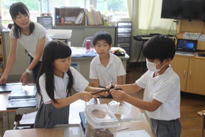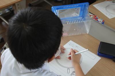 生活科では、「あきとなかよし」という学習をしています。この日は、生き物となかよしということで、家から持ってきた虫や、学校で捕まえた虫などの観察を行いました。カブトムシやバッタなどを虫かごから出して、形や色・体のつくり・においなど気づいたことを学習シートにまとめました。子らから丁寧にお世話をして、命の大切さを学習します。