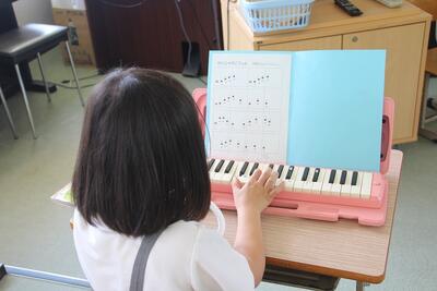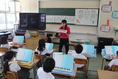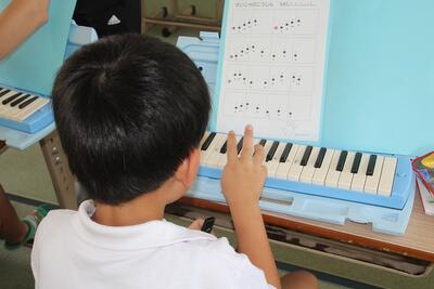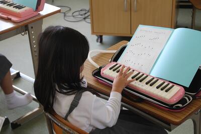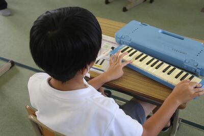 音楽科では、「けんばんハーモニカとなかよくなろう」という学習を始めました。けんばんハーモニカの特徴や音色を知り、音の高さや旋律を感じとりながら演奏をしていきます。1年生は保育園時代にも使ったことがあるので、けんばんハーモニカに慣れている感じでした。