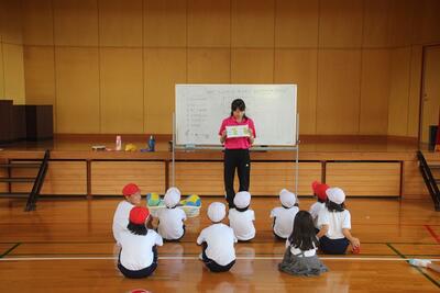 体育科では、マット運動遊びの学習をしています。この日は、いろいろな動きを楽しみました。手押し車や低い姿勢、橋をとびこえる動きなど行いました。学習の振り返りでは、自分の感想などを伝え合いました。健康な体づくりを行う1年生です。