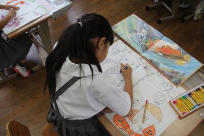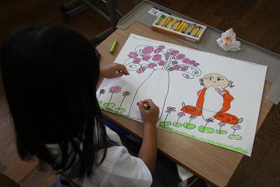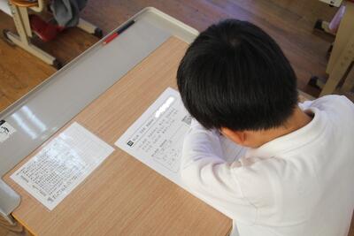 国語科では、物語「はなのみち」を使って、場面の様子や登場人物の行動など物語の大体を読み取る学習をしています。この日は、学習シートに「くまさん」の行動をまとめました。本文と挿絵を見比べながら書きました。