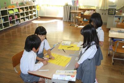 生活科では、近くの保育園の園児の皆さんと「秋パーティー」を行う予定です。この日は、その活動の役割分担や案内状の作成を行いました。昨年まで同じ保育園で一緒だった人たちとの交流ということで、1年生は意欲満々です。楽しいパーティーになると確信しています。