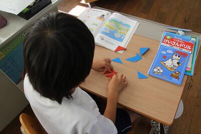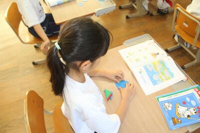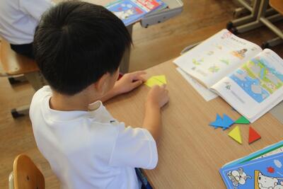 算数科では、かたちづくりの学習に入りました。この単元では、色板や棒などを使ってさまざまな形を作る活動を通して、図形を構成する力と観察する力を身に付けることをねらっています。この日は、色板を並べていろいろな形をつくる活動を行いました。これから図形に関する基本的な見方・考え方を身に付けていきます。