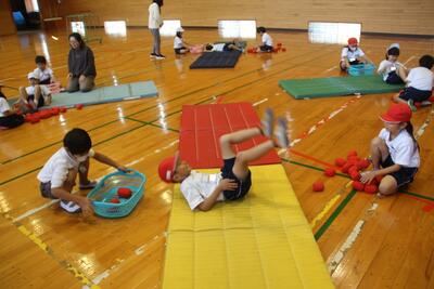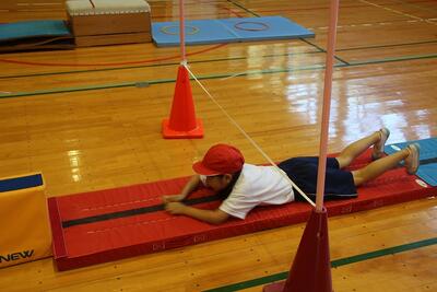 体育科では、マット運動遊びを学習しています。この日は、後ろ回りの基礎感覚づくりとして、玉入れの球を両足ではさみ、体を折り曲げながら頭の近くにあるかごに入れる活動を行いました。後ろ回りで勢いをつけるためには、両足の使い方がポイントの一つになります。1年生は友達と協力して、ゲーム感覚で動きを身に付けました。