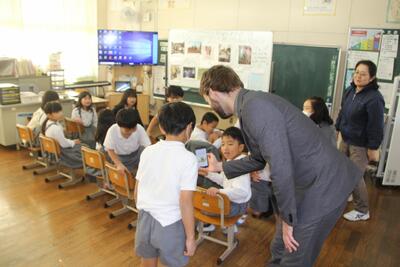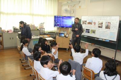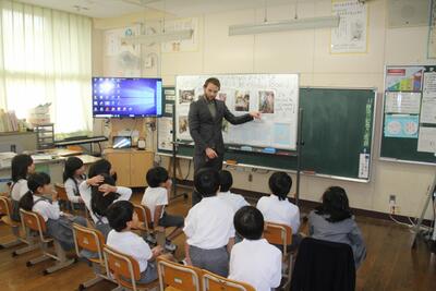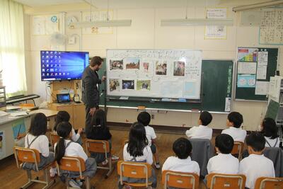 ALTのJ先生と一緒に学習しました。この日が初めてで、2年生と一緒にJ先生の話を聞いたり、質問をしたりしました。好きなポケモンについての質問の時が大盛り上がりでした。