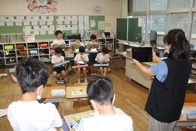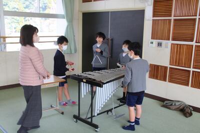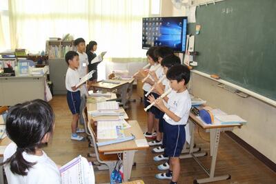 音楽科では、音の高さに気をつけながら歌ったりひいたりする学習をしています。この日は、「ドレミで歌おう」の曲を、鍵盤ハーモニカで指くぐりや指またぎの練習をしました。指を上手に動かしながら、高い音をひきました。