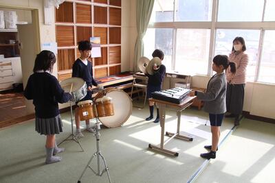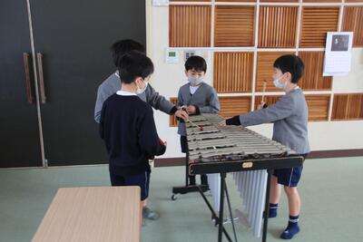 音楽科では、音のとくちょうを生かした音楽づくりの学習を行いました。打楽器などの音色を生かしてまほうの音楽をグループでつくる活動を行いました。打楽器の打ち方や音の響き・リズムなどをみんなで話し合いながらつくりました。
